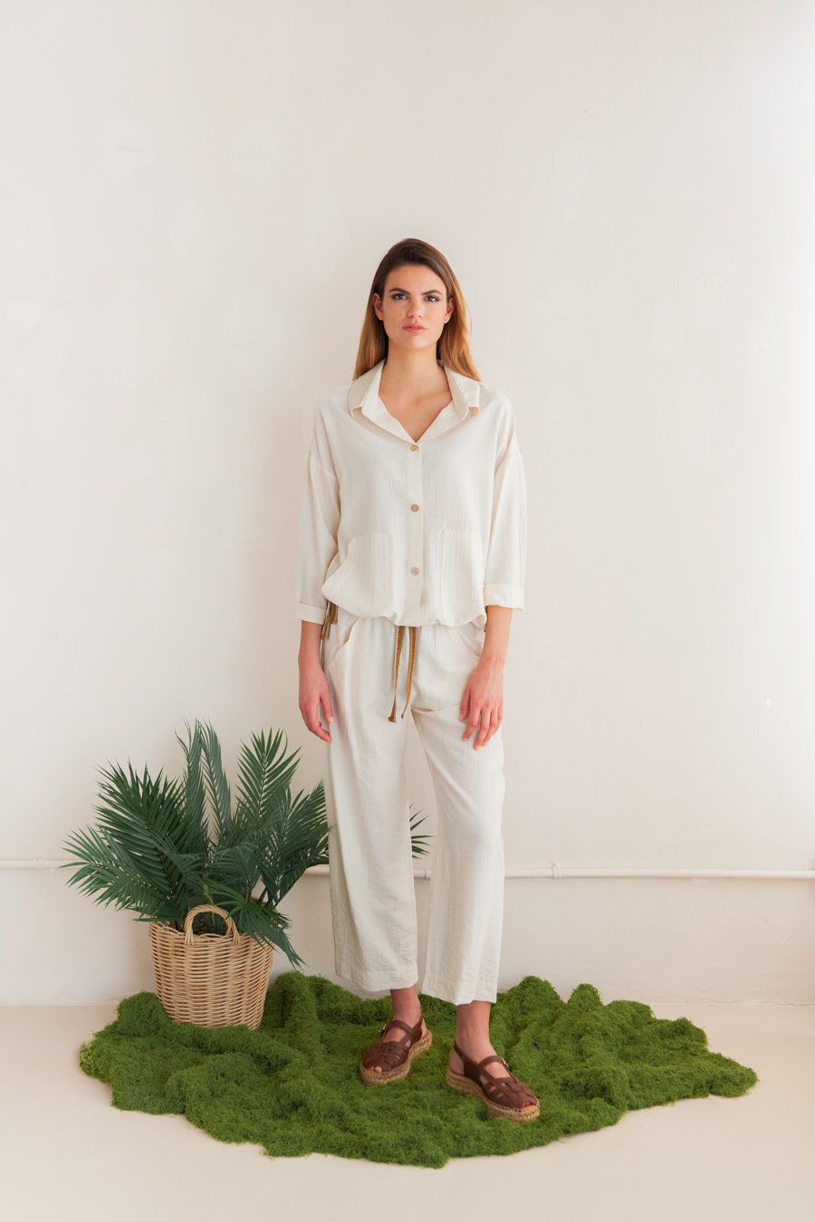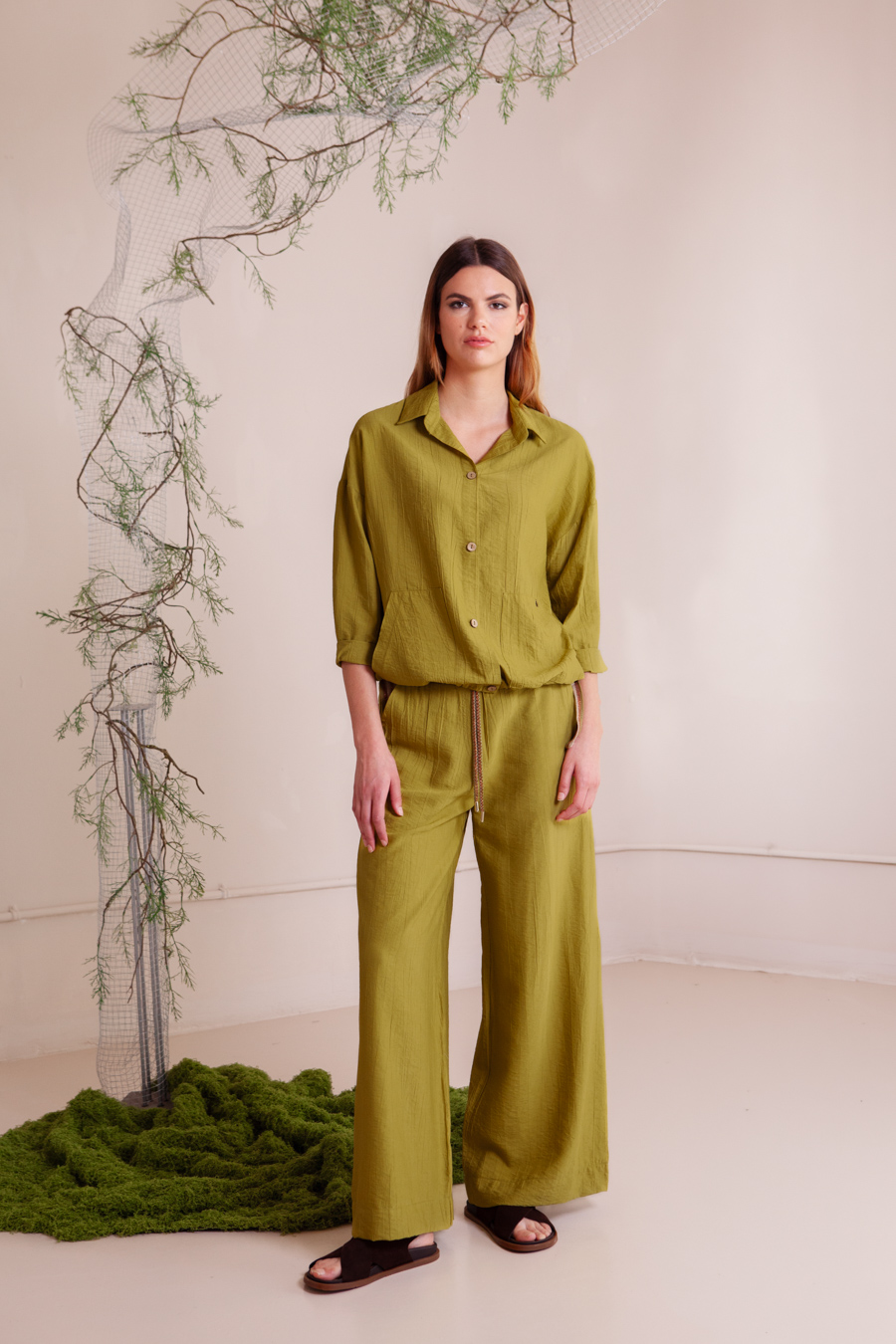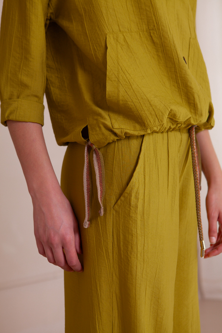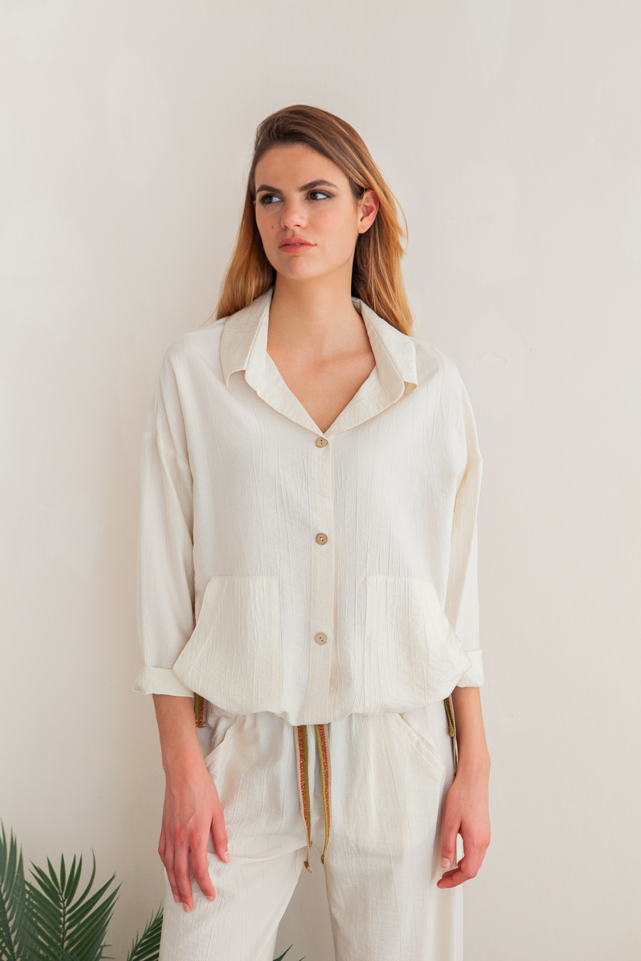 Sobrecamisa de manga larga con bolsillos plastones y cordones laterales de lurex para poder ajustar en la cintura.