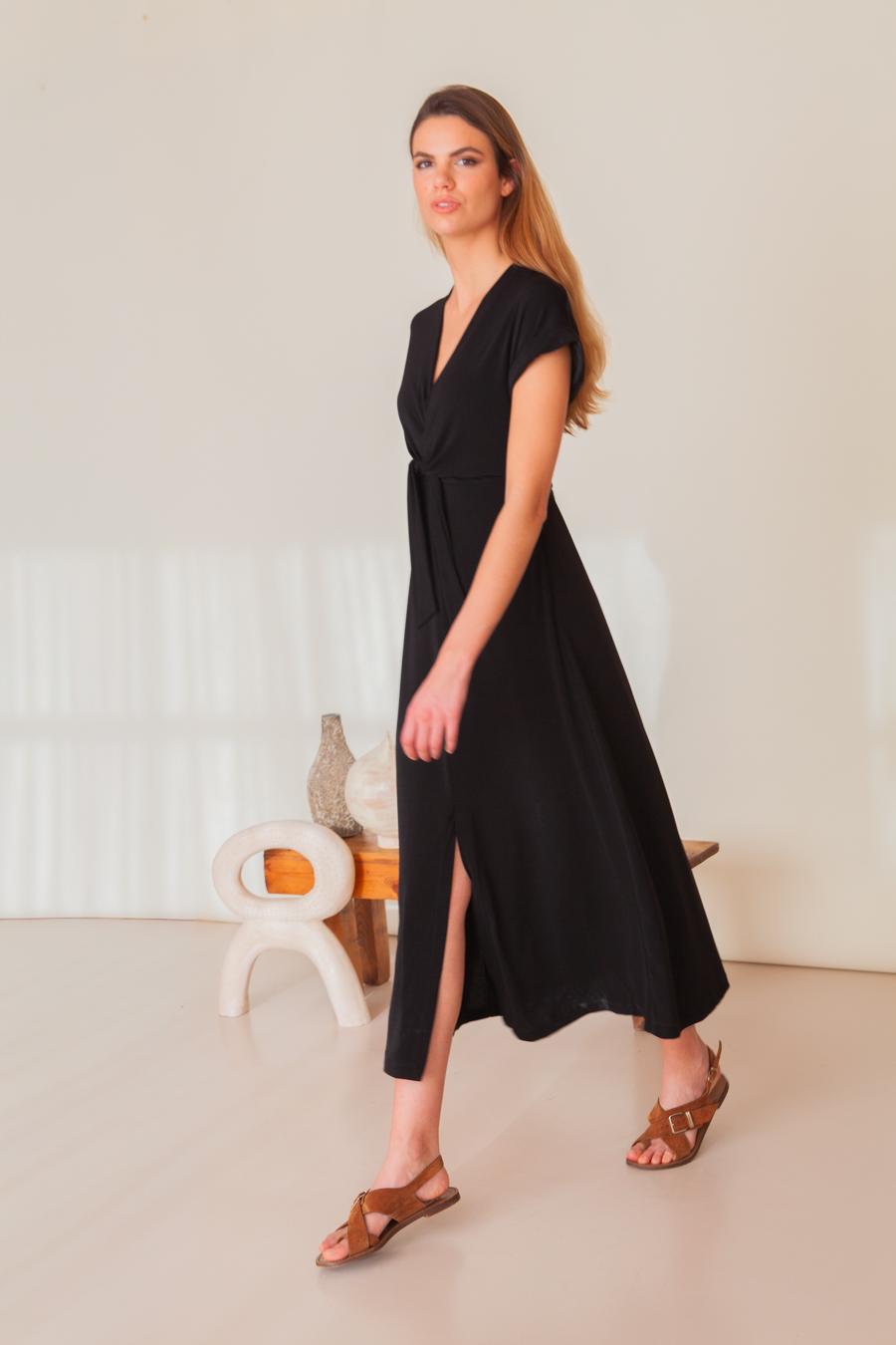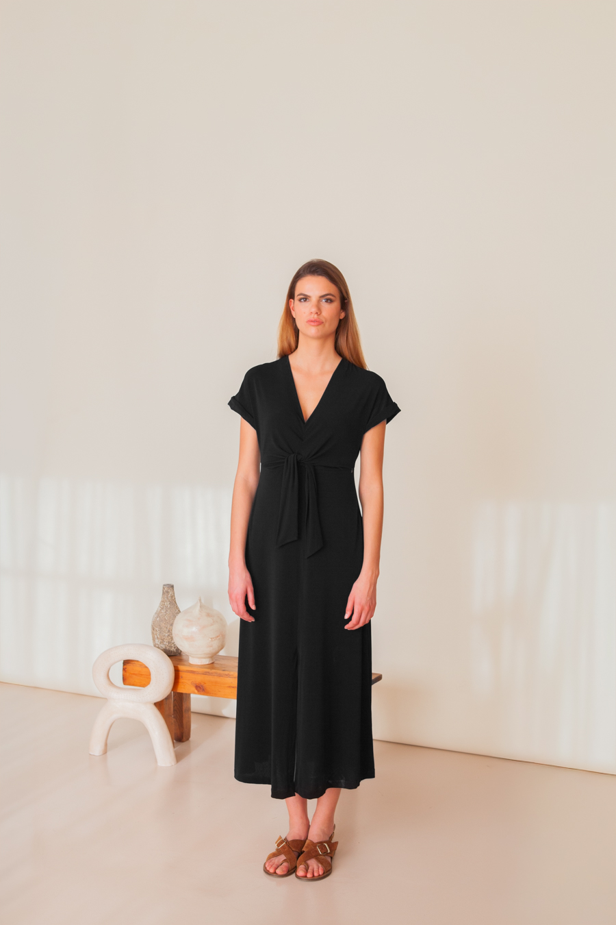 Vestido de punto con escote en pico, abertura en el delantero y detalle de lazada ajustable.