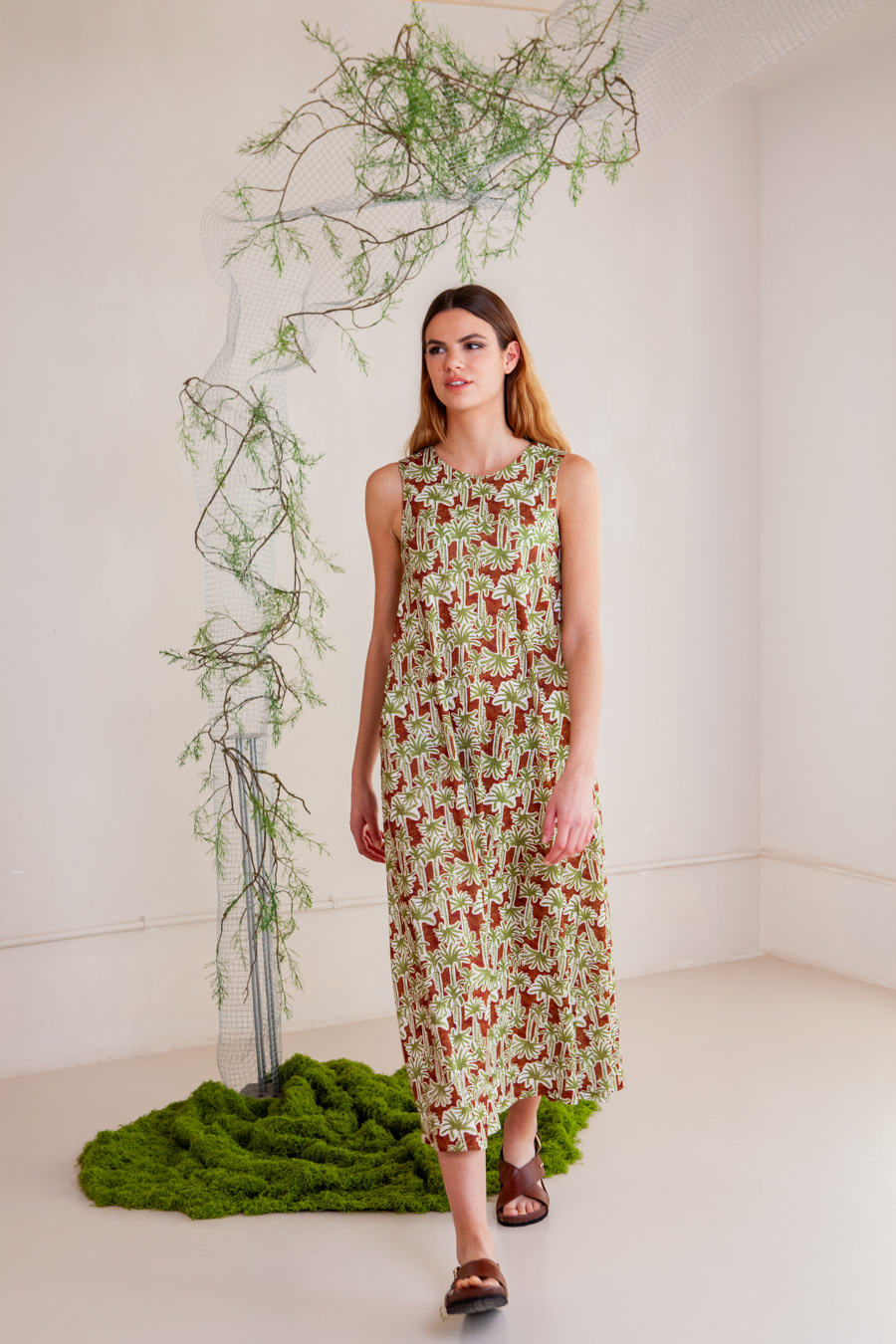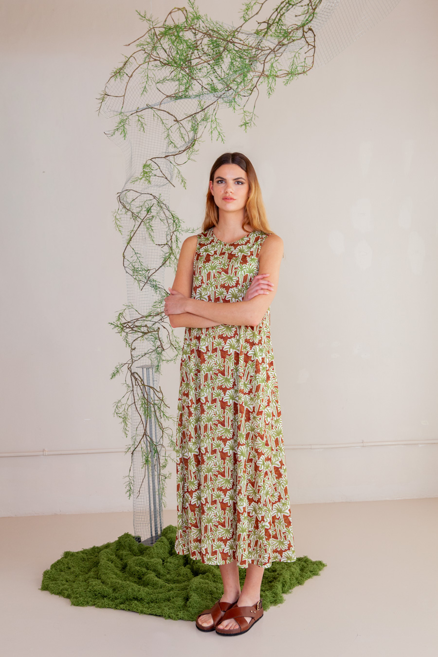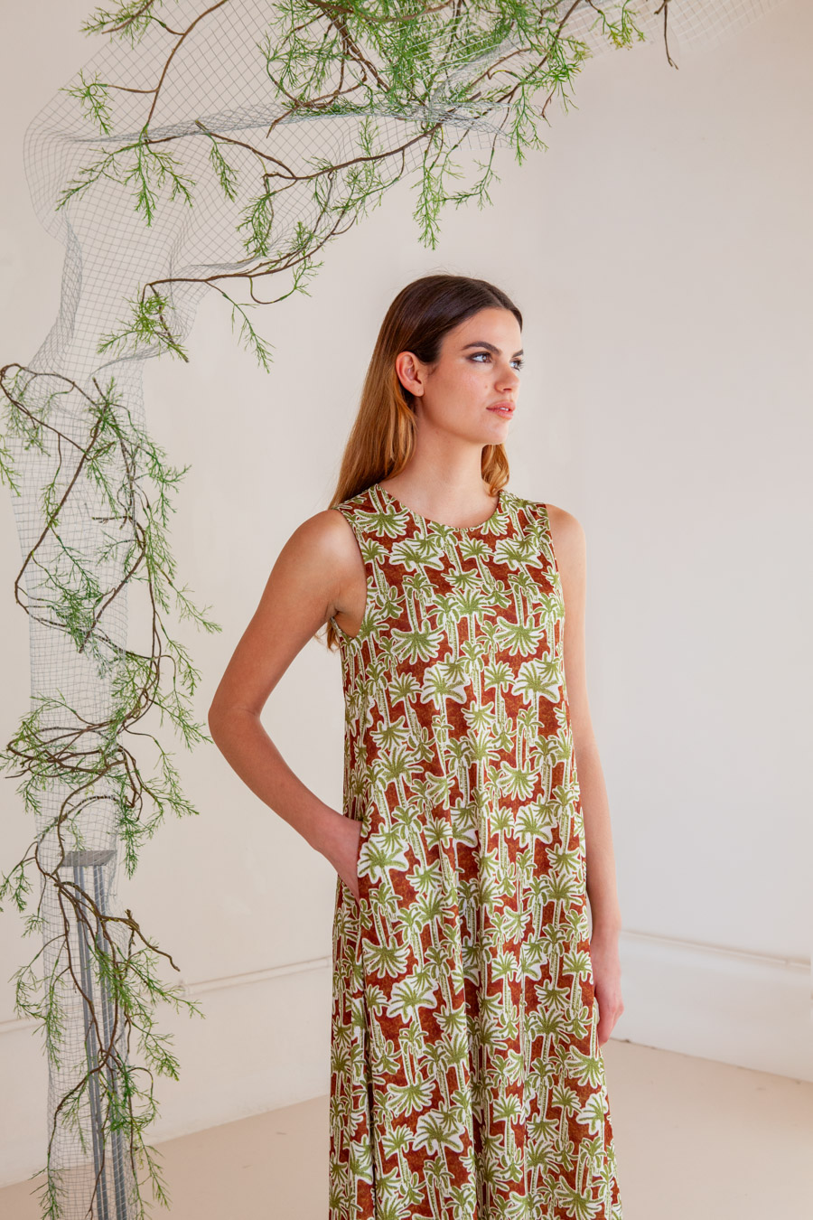 Vestido en tejido elástico evasé sin mangas con forro y bolsillos laterales.